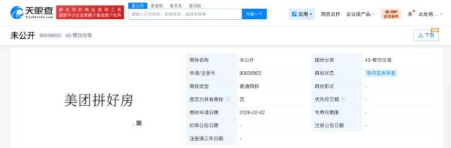 天眼查知识产权信息显示,近日,美团关联公司北京三快科技有限公司申请注册3枚“美团拼好房”商标,国际分类为科学仪器、金融物管、餐饮住宿,当前商标状态均为等待实质审查。北京三快科技有限公司成立于2007年4月,法定代表人为钟永健,注册资本54.8亿人民币,经营范围含软件销售、社会经济咨询服务、票务代理服务、信息系统集成服务、互联网销售等,由王兴、穆荣均共同持股。