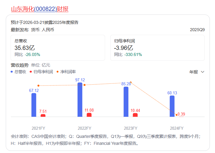 从业绩看,山东海化2021年至2024年归母净利润分别为7.51亿元、11.08亿元、10.44亿元、3921.67万元,从2022年起业绩呈逐年下滑态势。