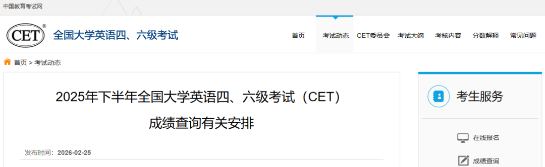 2月25日,中国教育考试网发布消息,2025年下半年全国大学英语四、六级考试(CET)成绩查询服务将于2026年2月27日(周五)上午6时开通,详情——