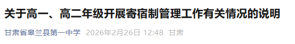 2月26日,皋兰县第一中学发布《关于高一、高二年级开展寄宿制管理工作有关情况的说明》: