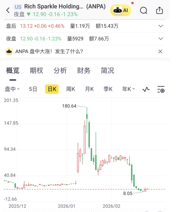 Rich Sparkle的股价在今年1月经历了“过山车”式的暴涨暴跌。红星资本局注意到,在短短5个交易日内,Rich Sparkle股价从25美元涨至最高180美元,涨幅达620%,随后一周时间又暴跌77%。截至美东时间2月25日,其股价已回落至13.06美元/股。
