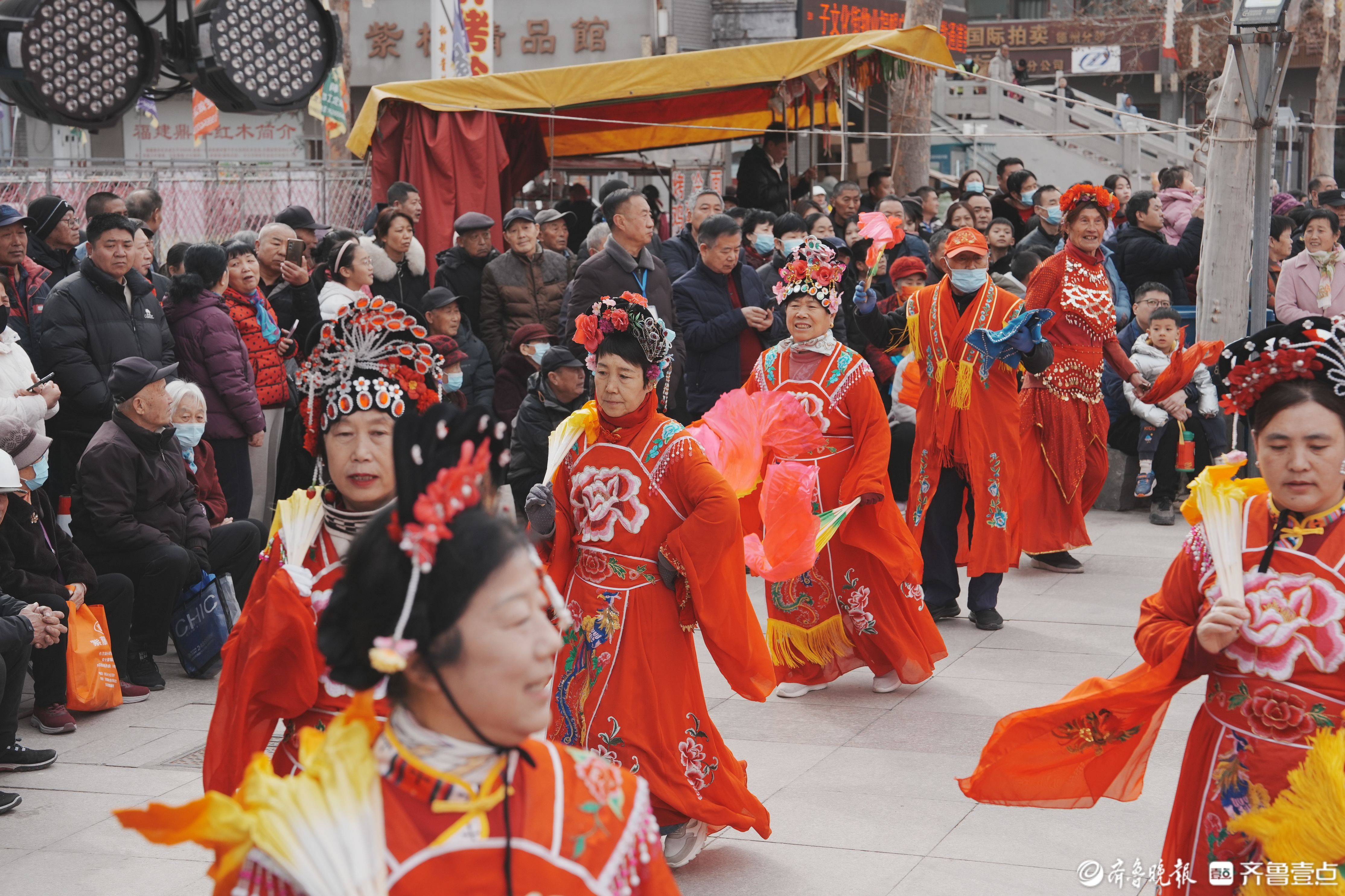 2月23日,董子文化街庙会现场,民间文艺巡游氛围感拉满,秧歌、舞龙、舞狮等传统项目轮番上演,演员们活力四射,引得观众阵阵喝彩,游客李先生感慨:“这热闹氛围让我找回了小时候过年的感觉,孩子们也看得开心。”歌舞、戏曲多元演出不断,还有“德州王婆说媒”趣味互动,为单身人士搭建缘分桥梁,现场笑声不断。