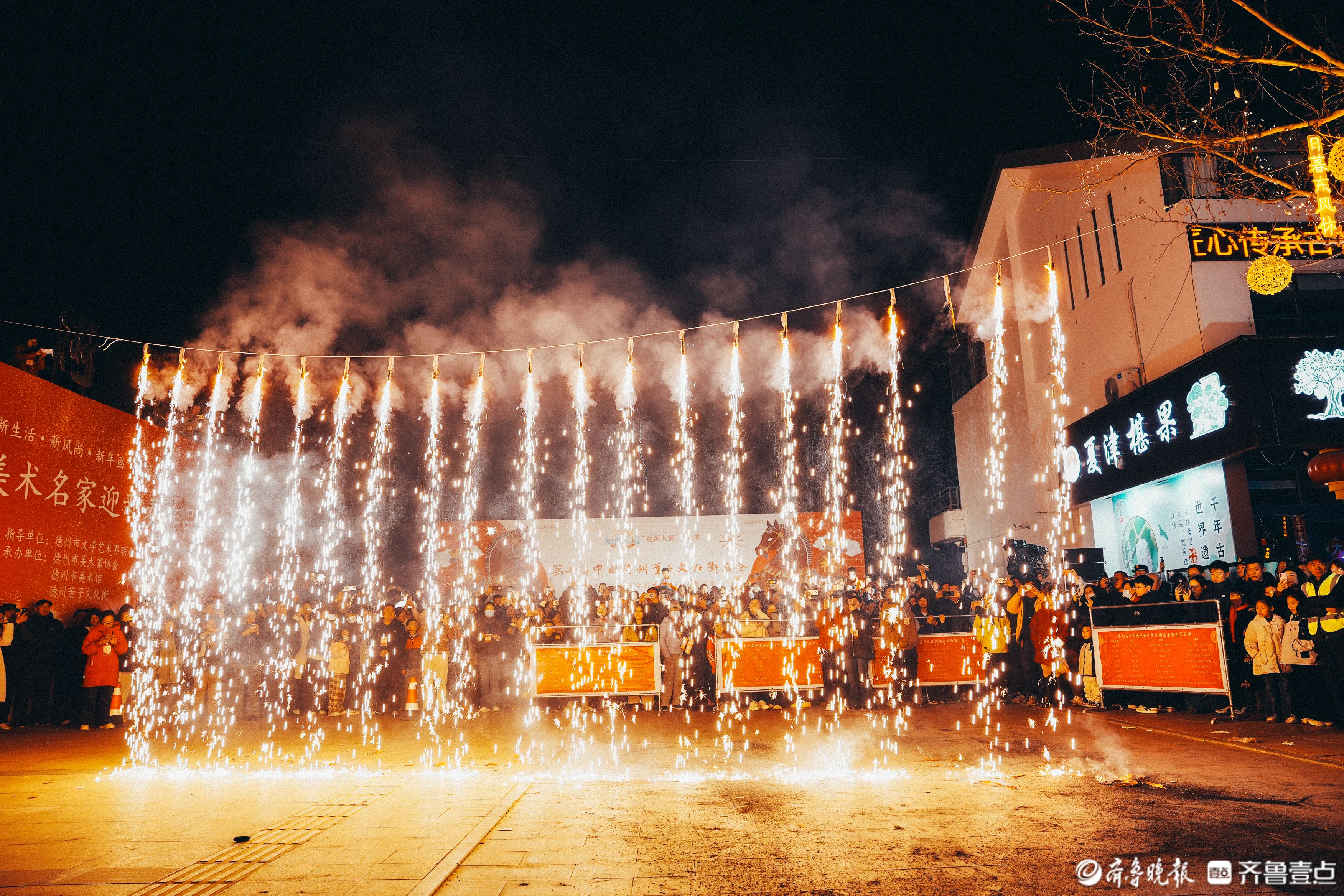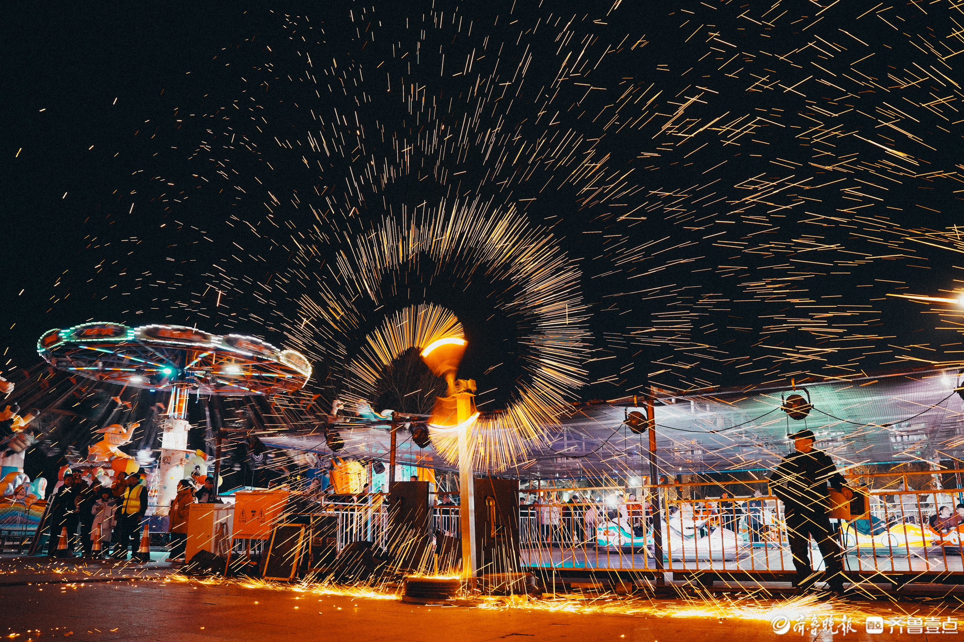 夜幕降临,庙会浪漫升级,风火轮、火壶、烟花瀑布三大花火项目璀璨夺目。外地游客王女士一家赶来,直言白天看民俗、晚上赏烟花,年味十足,对德州印象更深了。