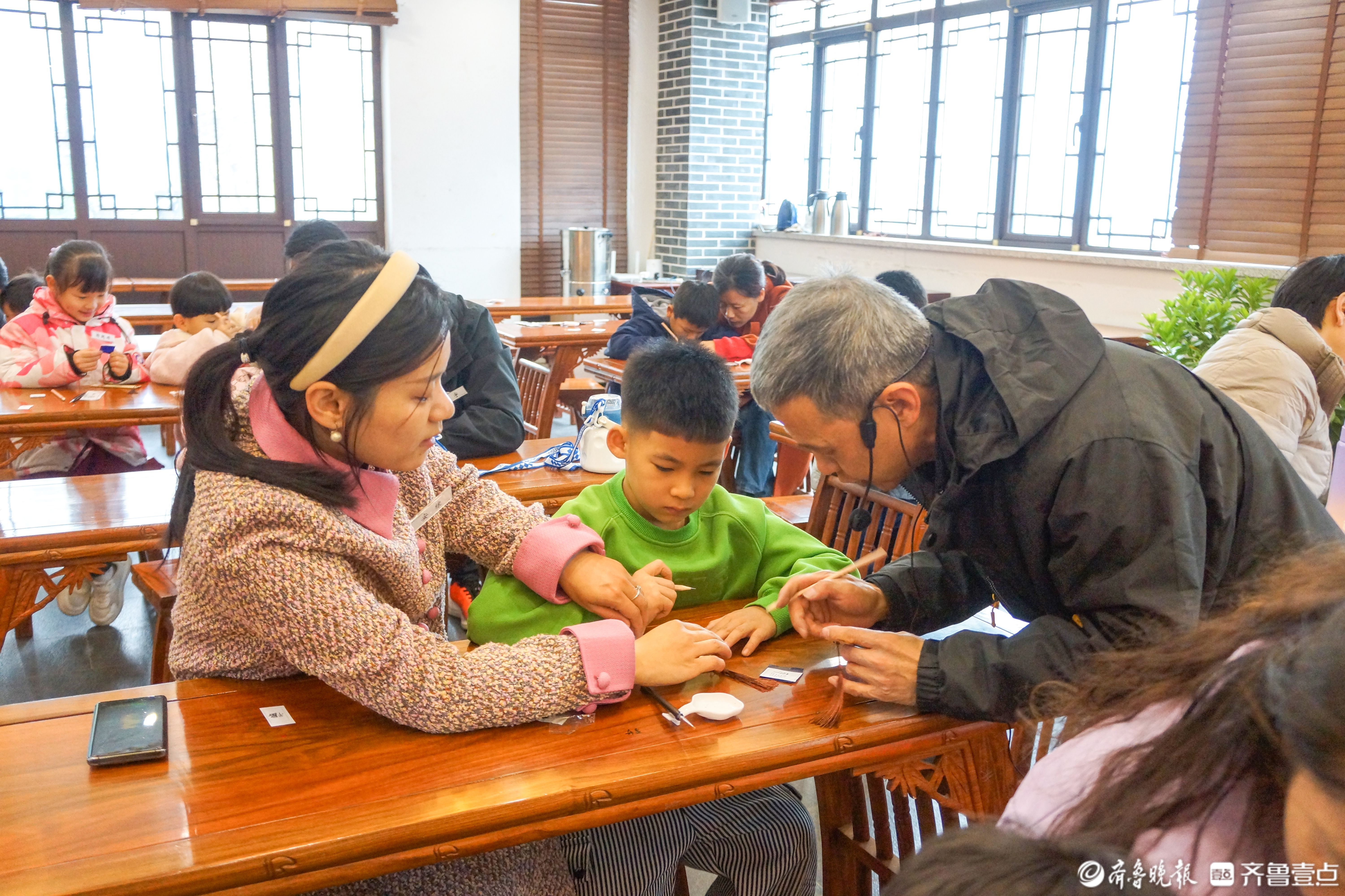 “制作一件黑陶需要多久?”“我之前只在视频里看过陶艺,今天自己上手做,才知道还挺难的。”在董子文化街,时常能看到的场景是孩子们一边提出自己的问题,一边兴致勃勃地参与各种非遗体验项目:有的专注地捏着陶艺,手指在柔软的陶土上灵动舞动,试图塑造出心中的理想造型;有的则手持刻刀,在木板上小心翼翼地雕刻;还有的认真地进行着金丝彩贴的制作,勾勒出精美的图案。