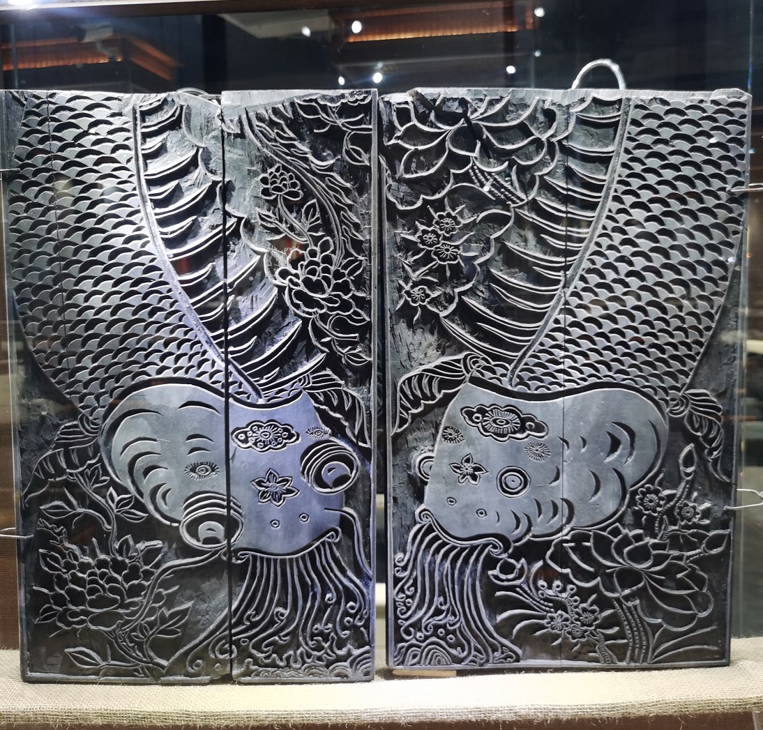 博物馆的藏品里有一件《双鱼图》。鱼在中国文化里有双重身份。一方面,“鱼”谐音“余”,代表着老百姓最朴素的愿望:年年有余,日子宽裕。另一方面,“鱼传尺素”的典故让它成为情感的载体,后来演变为贵族和官员随身佩戴的“鱼符”,以彰显地位。这幅雕版在前人基础上作了创新。两幅画里的鱼,一公一母,彼此呼应。一鱼眼为日,背景莲花,龙尾翻腾;一鱼眼为月,背景牡丹,凤尾摇曳。阳刚与阴柔,富贵与国色,全藏在这两条鱼的眉眼里。