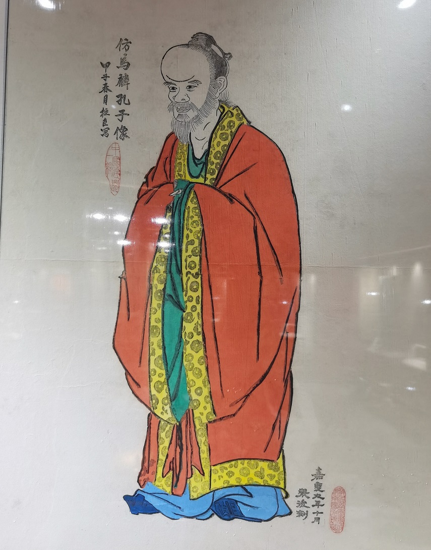 吴军有一块非常喜欢的版。那是馆藏的清代嘉庆九年雕刻的《孔子像》。画中的孔子体现了民间对智者和圣人“七陋”之说的智慧——大额头、眼漏睛、朝天鼻、嘴漏齿、耳垂肩,不是在形容丑与俊,而是在描述智者与圣人的与众不同。原作出自宋代大画家马远之手,不是画“像”,而是画“气”。追求气息、韵味、不可言说的东西,这是吴军喜欢的“宋人风雅”,赵佶的瘦金体、汝窑的天青色、苏轼的“大江东去”,都是这种“气”。