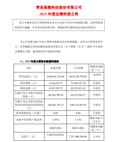 2月26日盘后,高测股份(688556)发布2025年度业绩快报,报告期内实现营业收入36.49亿元,同比下降18.43%;归属于母公司所有者的净利润亏损4016万元。
