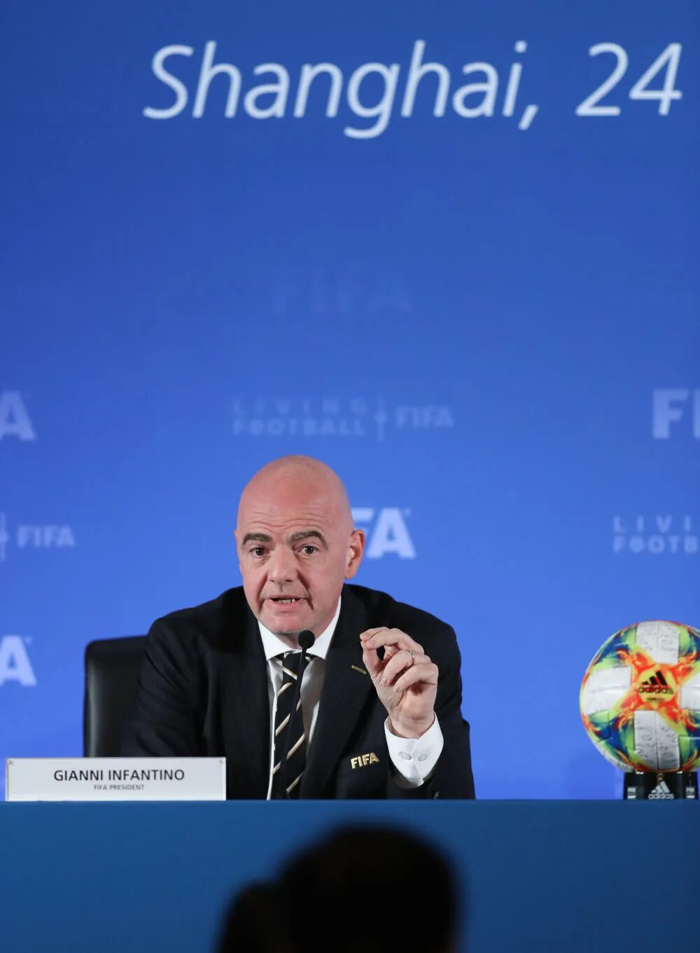 资料图:2019年10月24日,国际足联主席因凡蒂诺在上海举行的国际足联理事会新闻发布会上讲话。新华社记者 丁汀 摄