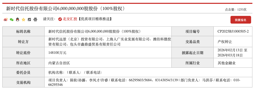 近日,新时代信托股份有限公司(下称“新时代信托”)60亿股股份(100%股权)转让项目继续在北京产权交易所挂牌,转让底价为14.81亿元,挂牌起止日期为2026年2月13日至3月18日。