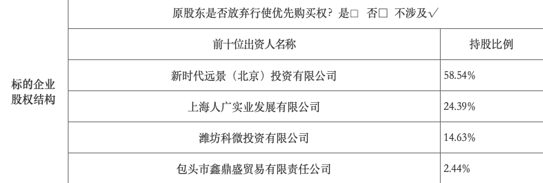 挂牌信息显示,此次新时代信托100%股权共有4家转让方,分别为新时代远景(北京)投资有限公司、上海人广实业发展有限公司、潍坊科微投资有限公司(下称“潍坊科微”)和包头市鑫鼎盛贸易有限责任公司,持股比例分别为58.54%、24.39%、14.63%和2.44%。