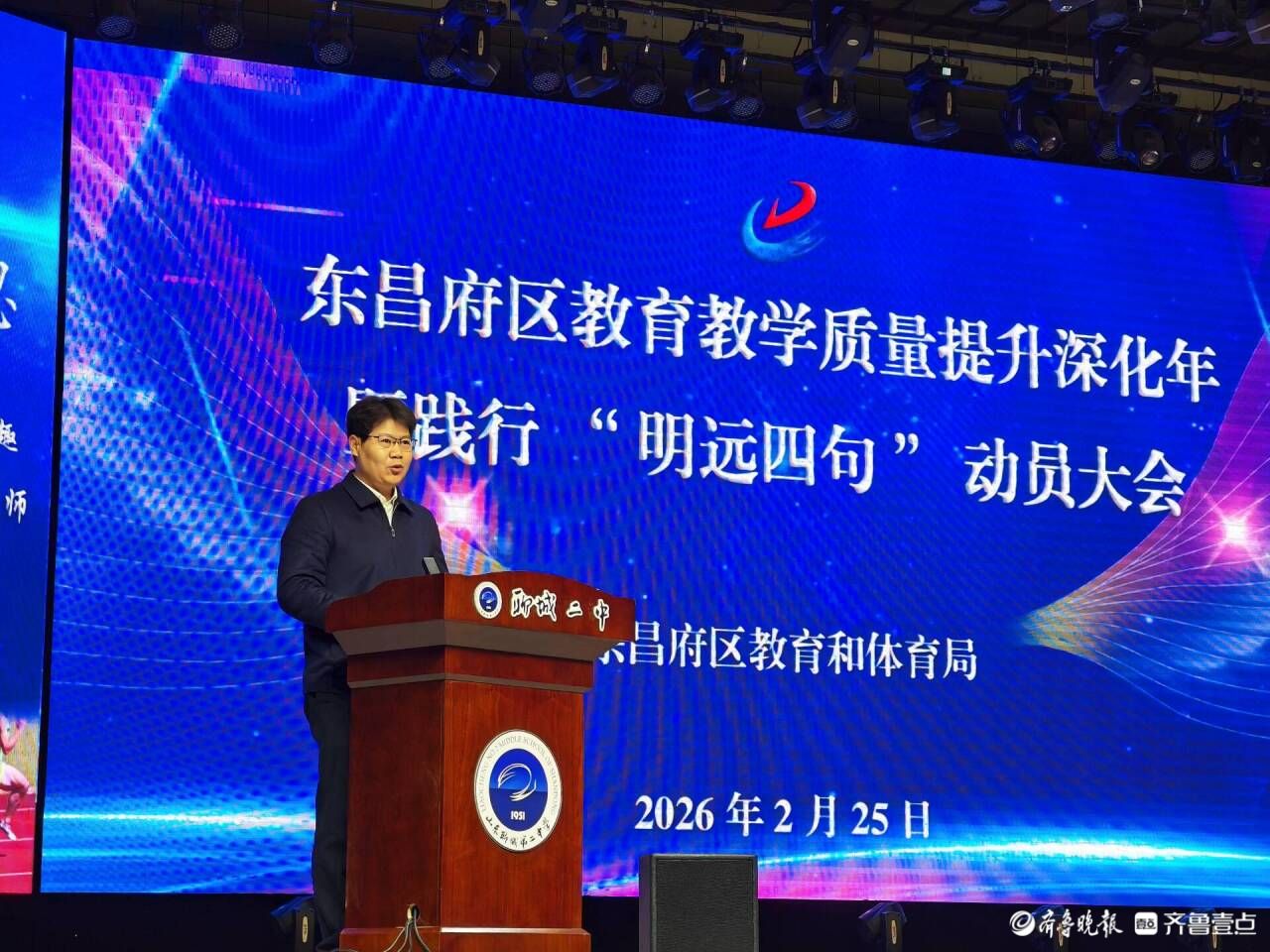 会上,区教科研中心八级职员王涛传达了《东昌府区践行“明远四句”工作方案》,聊城七中、英特学校相关负责人作了典型发言,区教科研中心负责人邱子华全面回顾了2025年教育教学质量提升突破工作、安排部署了2026年教育教学质量提升深化工作。