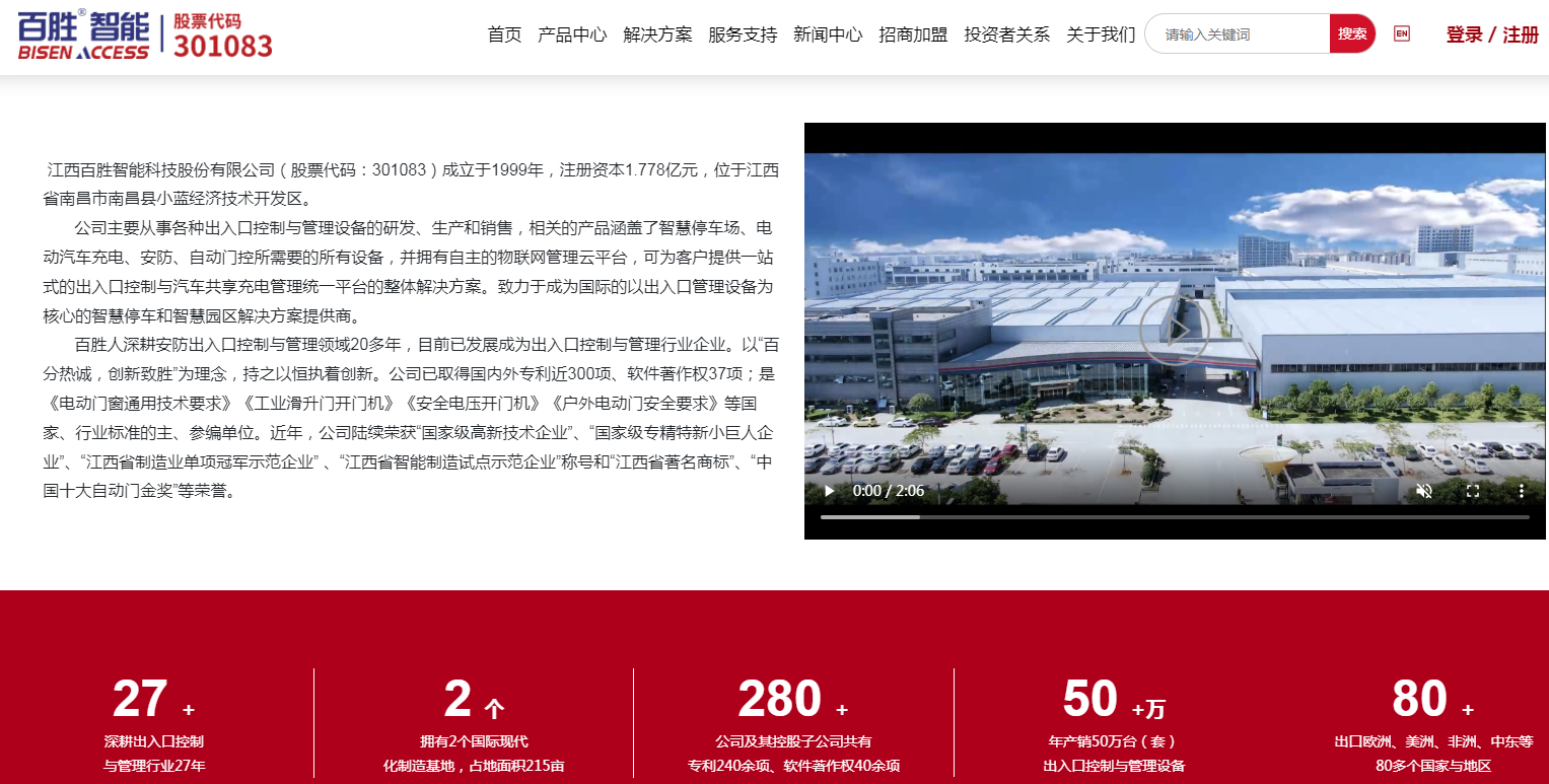 据百胜智能官网介绍,公司成立于1999年,注册资本1.778亿元,主要从事各种出入口控制与管理设备的研发、生产和销售,相关的产品涵盖了智慧停车场、电动汽车充电、安防、自动门控所需要的所有设备,并拥有自主的物联网管理云平台,可为客户提供一站式的出入口控制与汽车共享充电管理统一平台的整体解决方案。