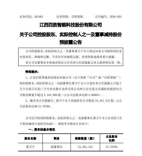 2月25日,百胜智能(301083)发布公告称,公司控股股东、实际控制人之一及副董事长龚卫宁拟于2026年3月19日至6月18日期间,通过集中竞价及大宗交易方式减持不超过5335999股,占公司总股本3.0000%,其中集中竞价不超过1778666股(占公司总股本1.0000%)、大宗交易不超过3557333股(占公司总股本2.0000%),减持目的是自身资金需求。