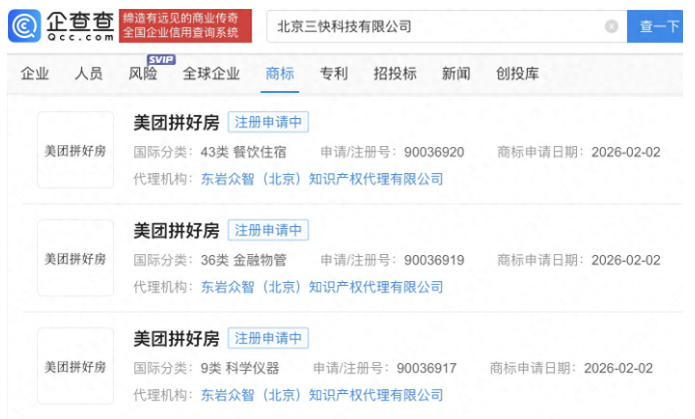 企查查APP显示,近日,美团关联公司北京三快科技有限公司申请注册3枚“美团拼好房”商标,国际分类为科学仪器、金融物管、餐饮住宿,当前商标状态均为注册申请中。(企查查)