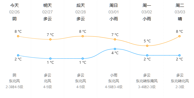 3月1日,多云转阴有小雨,东北风4~5级,沿海1℃~7℃,内陆0℃~8℃。