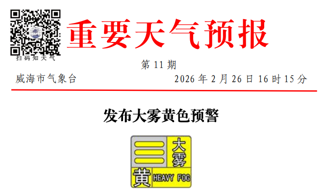 威海市气象台2月26日16时15分发布大雾黄色预警