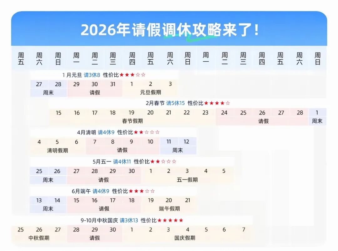 依据国务院办公厅2026年节假日官方安排,有网友整理全网最实用拼假攻略,清明、五一、端午、中秋国庆全覆盖,用最少年假,换最长快乐。