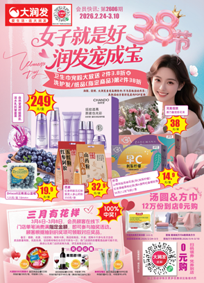 近日,大润发春节假期后的首个促销档来袭,围绕女性关怀、家庭清洁、元宵节温情三大消费场景推出超值优惠活动,通过差异化商品组合与阶梯式促销策略,打造"省心、实惠、有仪式感"的春季焕新体验,点燃春日消费热情。