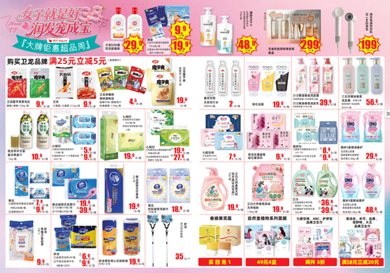 38妇女节前期,大润发就做好了为女士争取优惠权益的打算,直至2月24日,这份权益正式上线,多个品牌女性专属用品让利促销。苏菲、七度空间、高洁丝、护舒宝……促销活动几乎覆盖市场主流售卖品牌,其中最值得关注的福利是七度空间、ABC、护舒宝品牌卫生巾两件5折,高洁丝、未可、由意、倍舒特、大王品牌卫生巾满58元立减20元!此外,女性生理期期间,对于卫生巾的要求会更多,大润发“新日期、多款式、立刻到”的购买优势显然成为更多女性消费者的首选。