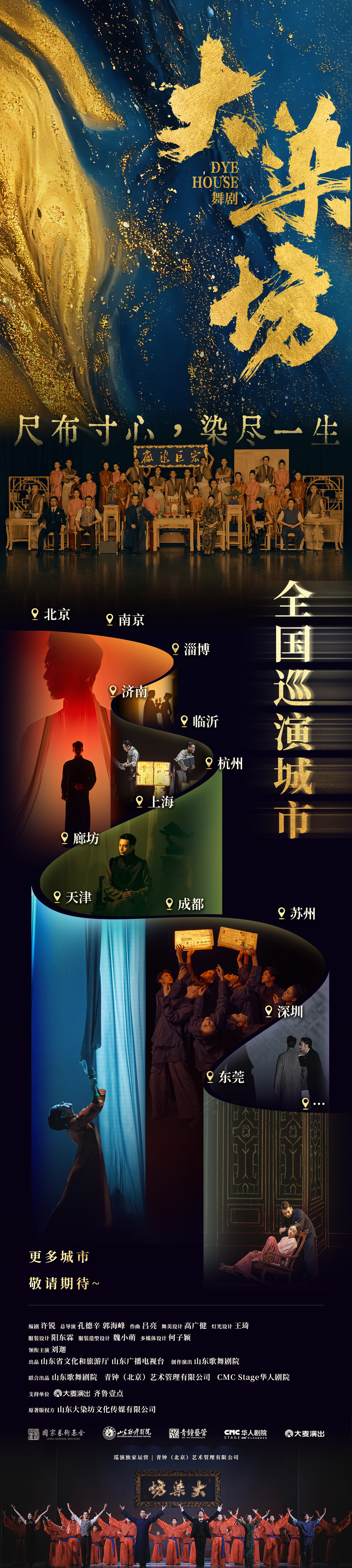 本次全国首轮巡演覆盖面广,涵盖北京、南京、淄博、济南、临沂、杭州、上海、廊坊、天津、成都、苏州、深圳、东莞等十余座城市,后续还将有更多城市陆续解锁。作为山东精心打磨的力作,《大染坊》此前已完成内部试演,并亮相山东春晚,收获各界好评与满堂喝彩。今年4月16日—18日,该剧将在国家大剧院进行全国首演,连演三场,正式开启全国巡演之旅。