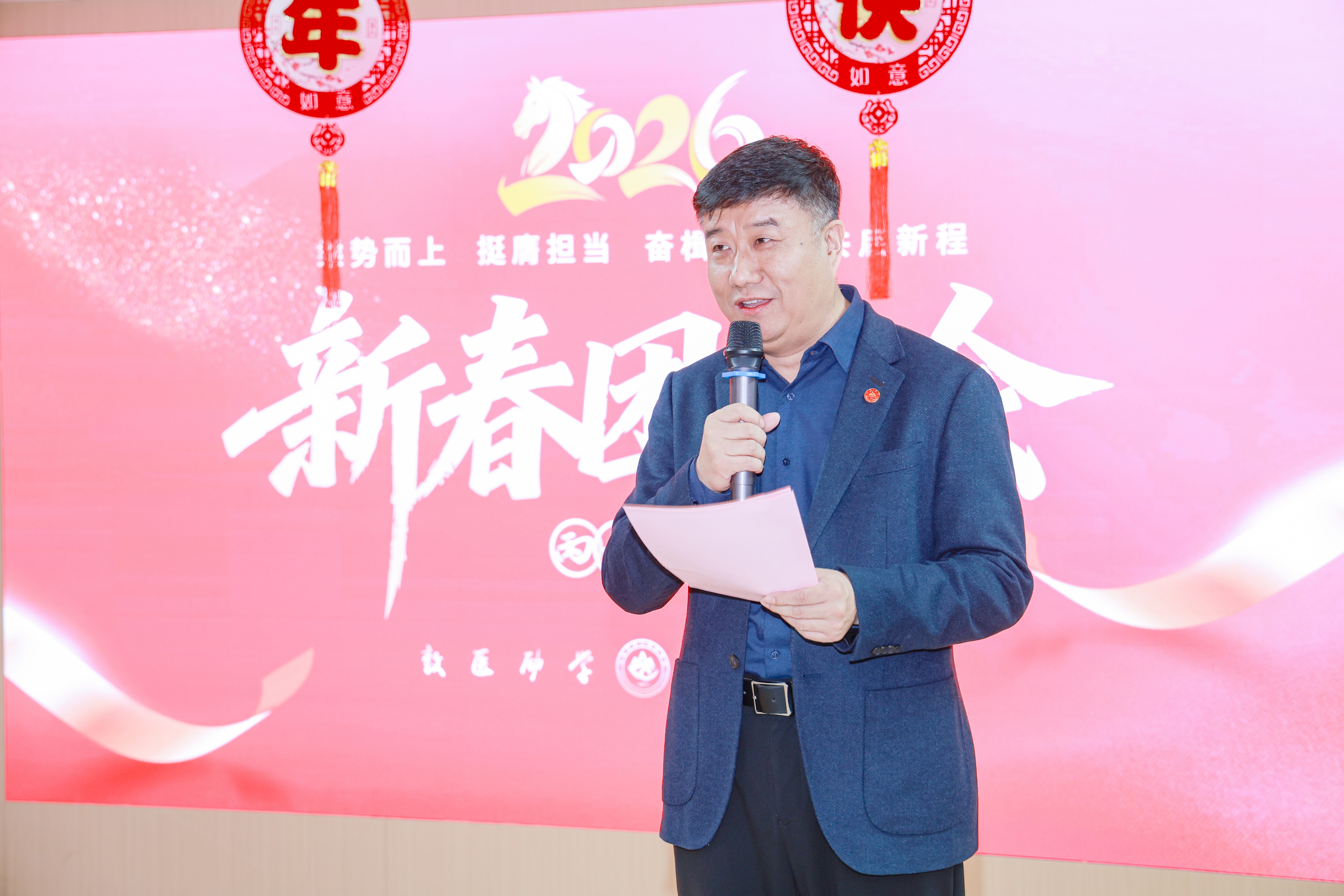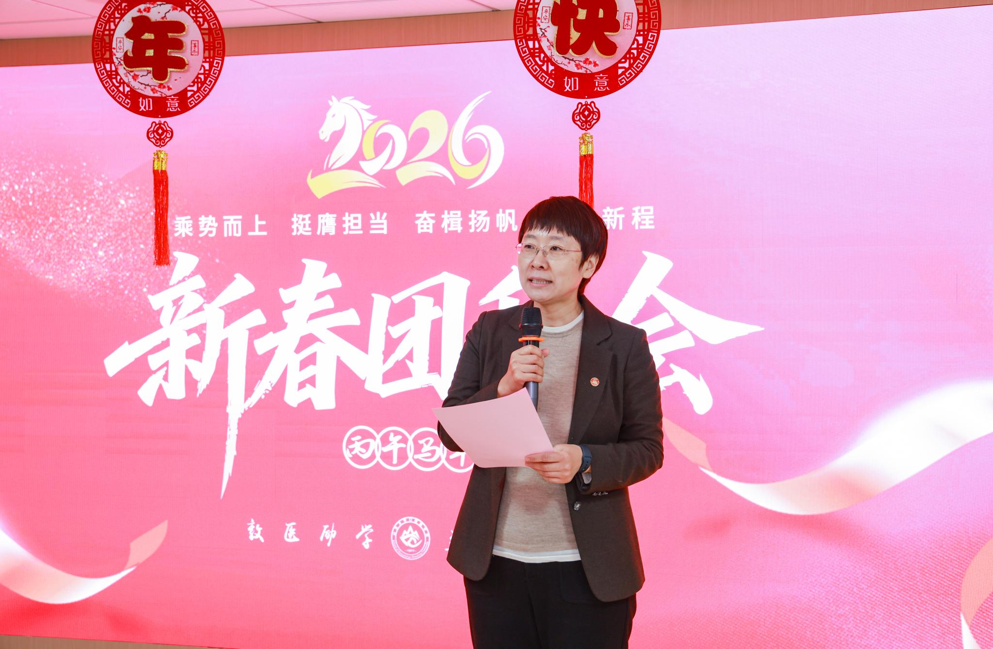 新春团拜会上,张青代表领导班子向全体教职医务员工致以新春祝福。他指出,新春团拜会既是诚挚问候,更是“收心会”“动员会”和“誓师会”,医院上下要以“开局即决战”的姿态重启破局,以“一马当先”之勇抓实抓细重点工作落实,以“策马扬鞭”的姿态攻坚克难,奋力谱写学院(医院)高质量发展新篇章。葛少华指出,2026年是学院(医院)事业发展的转型期、机遇期和决胜期,希望全体教职医务员工以龙马精神为帆,以实干担当为桨,围绕“临床医疗建设年”这一核心任务,在推动高质量发展的赛道上策马扬鞭、勇往直前,共创山大口腔的美好未来。