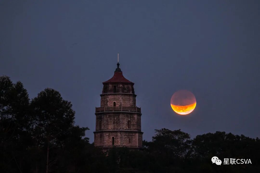 ▲星联CSVA摄影师詹煌根,2021年11月19日月食,拍摄于广东省梅州市狮雄古塔