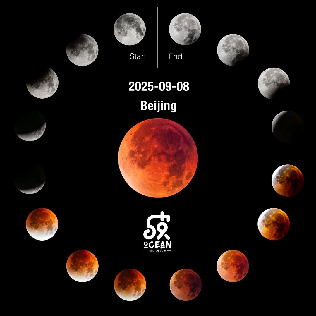 ▲“时间串”。星联CSVA摄影师刘洋,2025年9月7日夜-8日凌晨的月全食,摄于北京