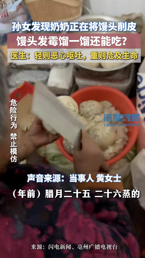 近日,网友黄女士发现奶奶在家削馒头皮,而馒头已经变质,表面布满了霉点。