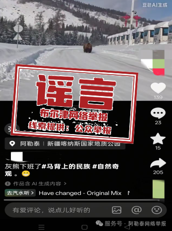近日,有网民在社交平台发布视频,声称“新疆喀纳斯出现棕熊”“阿勒泰遇到熊大了”。经相关部门核查确认,视频为AI生成,并非真实拍摄画面,属地未发生此类“熊出没”事件,该消息属于不实谣言信息。提醒:请各位网民自觉抵制和积极举报网上不实信息,网络不是法外之地,请广大网民自觉做到不造谣,不传谣,不信谣。(布尔津网信)