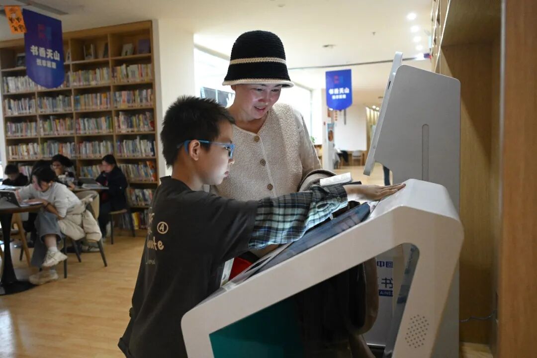 市民齐女士带着上五年级的侄子,正在使用百姓书房的智慧系统检索书籍。孩子随后捧着一本画册看得入神,她则在一旁静静陪伴。“他平时就喜欢看带图画的书。”齐女士说,“还是纸质书好,希望他平时少接触些电子产品,多读些名著。”