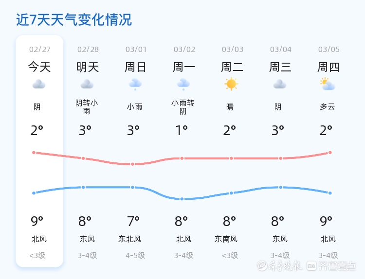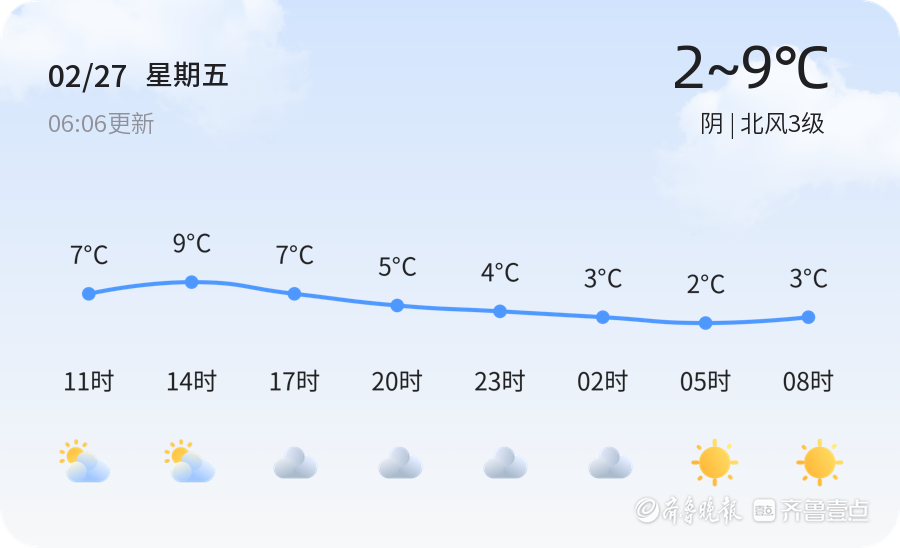 今天是2月27日,星期五,农历正月十一。日照市今日天气阴,气温在2℃到9℃之间,北风3级,空气湿度较高,PM2.5指数为74。各区整体天气情况平稳,以阴天为主,市民需注意保暖。