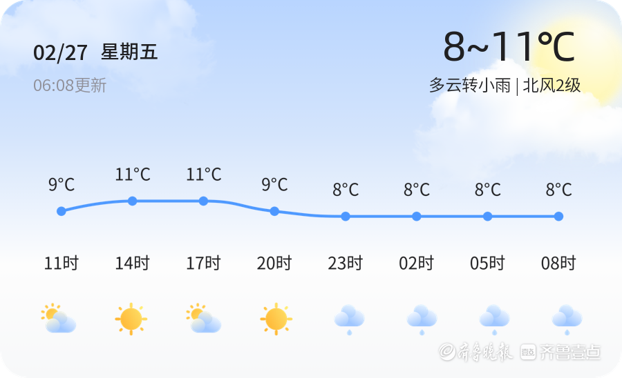 今天是2026年2月27日,星期五,农历正月十一。菏泽市的天气为多云转小雨,当前温度5.6℃,最高气温11℃,最低气温8℃。北风2级,湿度89%,空气质量为中度污染。今天的天气状况对市民的出行产生了一定影响,特别是降雨可能导致道路湿滑,建议市民出行时携带雨具,减速慢行,注意交通安全。空气质量方面,PM2.5指数为140,属于中度污染,建议敏感人群减少户外活动,必要时佩戴口罩。