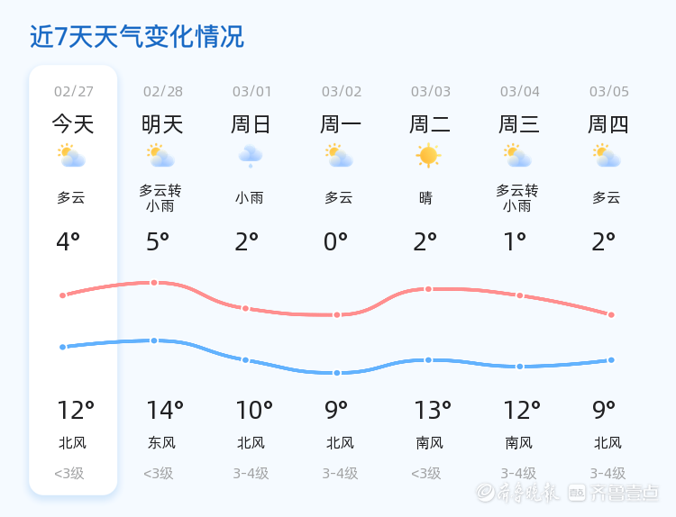 据气象部门预测,明日(2月28日)泰安市天气将由多云转为小雨,气温略有上升,最低气温5℃,最高气温14℃。与今日相比,明日不仅有降雨,风向也将由北风转为东风,风力仍维持在<3级,市民出行需。