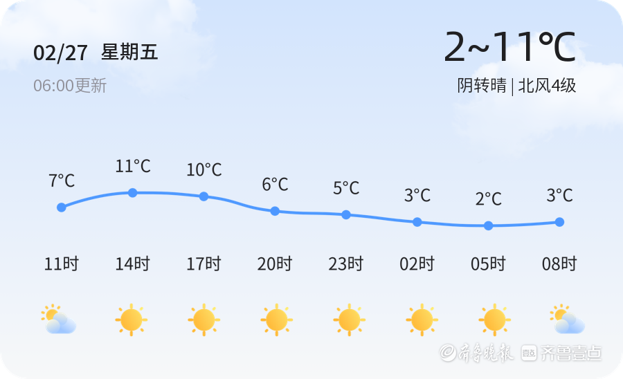 今天是2026年2月27日,星期五,农历正月十一。青岛市气象台于今日凌晨发布大雾橙色预警信号。目前青岛市胶北街道、平度市店子镇已出现能见度小于200米的大雾,预计今天凌晨到上午,我市部分镇和街道将出现能见度小于200米、局部能见度小于50米的大雾。市内天气为阴转晴,北风4级,气温范围在2℃至11℃之间。当前空气湿度为90%,PM2.5浓度为78微克/立方米,空气质量等级为良,对健康人群影响较小,但敏感人群仍需注意防护。由于大雾天气能见度较低,建议市民减少不必要的外出,出行时务必减速慢行,注意交通安全。未来三天,青岛市天气将以晴到多云为主,气温变化不大。明天(2月28日)为晴天,气温范围在2℃至12℃之间;3月1日为晴转多云,气温范围在3℃至9℃之间;3月2日为小雨天气,气温范围在5℃至8℃之间。由于大雾天气可能持续,请市民关注天气变化,合理安排出行计划,尤其是早晨和傍晚时段,驾车时务必开启雾灯,保持安全车距。温馨提示