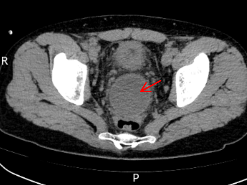 术前CT显示直肠前方一直径5cm圆形脓肿