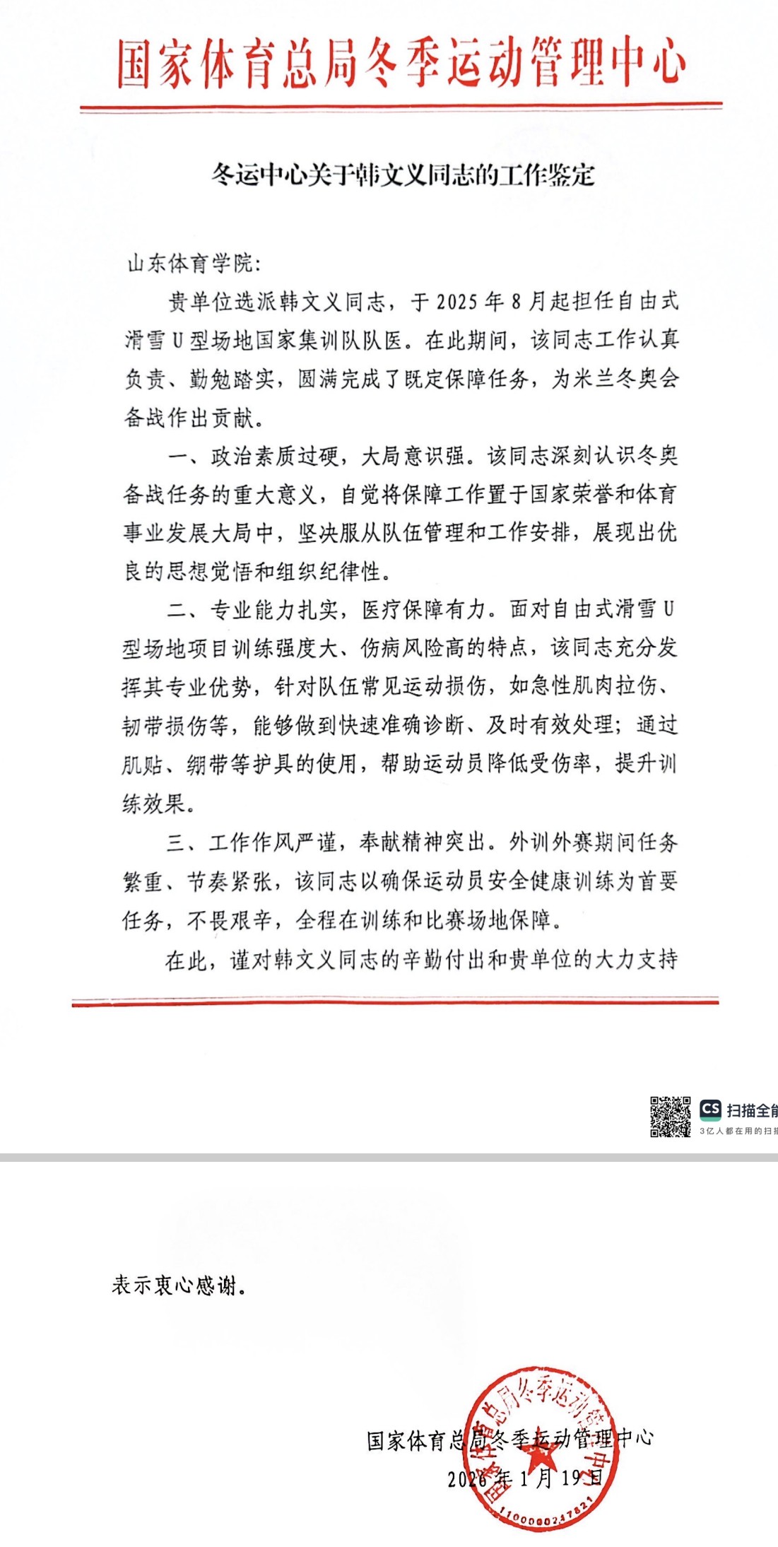 此届冬奥会上,谷爱凌、李方慧两人共获一金三银,韩文义及其所在医疗保障团队功不可没。国家体育总局冬季运动管理中心发来的工作鉴定中,对韩文义的付出和山东体育学院的支持表示感谢,并明确指出韩文义专业能力扎实,医疗保障有力,针对队伍常见运动损伤,能够做到快速准确诊断、及时有效处理,帮助运动员降低受伤率,提升训练效果。