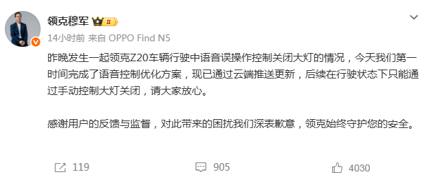 2月26日,针对男子驾驶领克Z20在高速上行驶意外触发语音助手误操作导致车祸一事,领克汽车销售有限公司副总经理穆军发文回应称:今天我们第一时间完成了语音控制优化方案,现已通过云端推送更新,后续在行驶状态下只能通过手动控制大灯关闭,请大家放心。