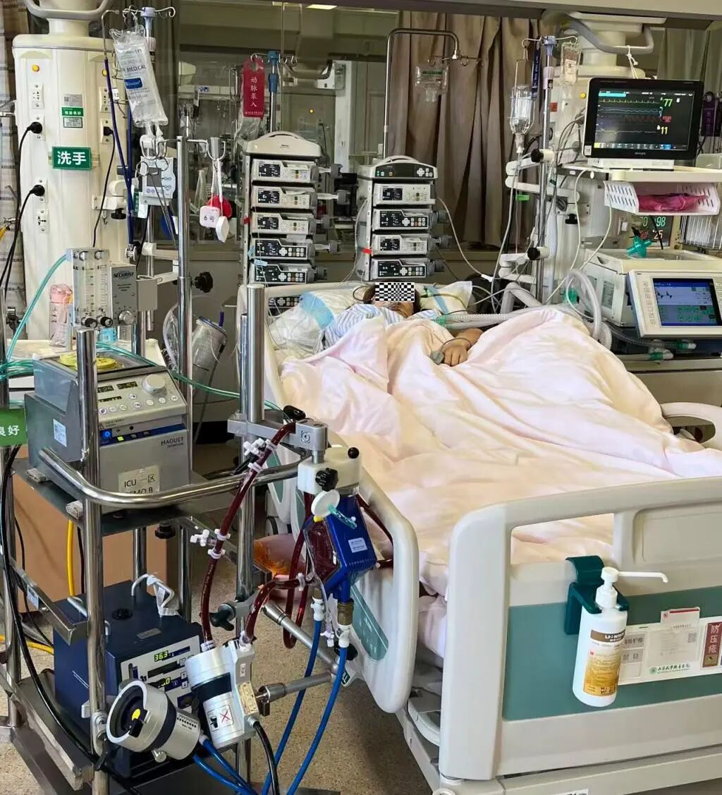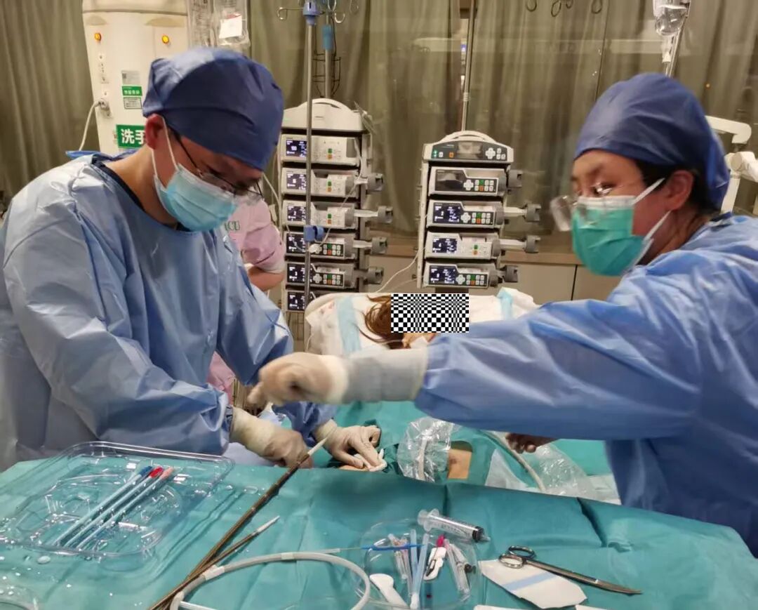 面对如此危重的状况,科主任王昊、副主任李琛、秦伟栋迅速沟通后果断决策:立即启动静脉-动脉体外膜氧合(VA-ECMO)治疗。经过ECMO团队半小时的努力,ECMO主机终于开始运转,当暗红色的血液变成鲜红色回输体内,患者的生命体征终于逐渐趋于稳定。