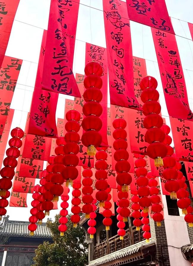 白天的金街,藏着不慌不忙的温柔。连绵的灯笼天幕悬于头顶,安静的街巷蜿蜒向前,红灯笼在阳光下熠熠生辉,不张扬却足够耐看。街角、墙边、门口的装饰彩蛋随处可见,不用刻意摆拍,走着走着,就能捕捉到满屏年味的治愈画面。