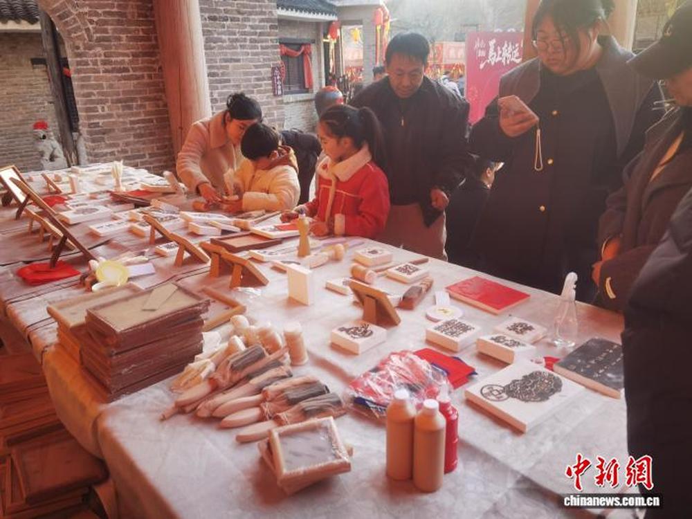 山东手造非遗体验区成为亲子家庭的热门打卡地。非遗拓片体验区排起长队,景区提供画像、字体拓版,游客亲手铺纸、上墨、捶拓,将“福禄寿喜”“马年大吉”等图案拓印成独一无二的新年伴手礼。