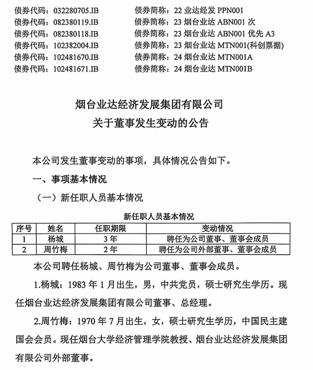 2月25日,烟台业达经济发展集团有限公司(下称“烟台业达经发集团”)公告称,聘任杨城、周竹梅为公司董事、董事会成员。