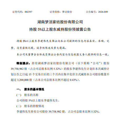 2月26日,梦洁股份(002397)发布公告称,持股5%以上股东李建伟因个人资金需求,计划在自公告之日起15个交易日后的三个月内,通过集中竞价方式减持不超过320万股公司股份,占公司总股本的0.43%。