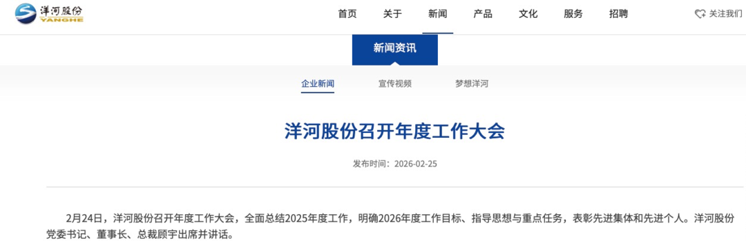 官网报道显示,洋河股份年度工作会议2月24日召开,会议总结2025年度工作,明确2026年度工作目标、指导思想与重点任务,表彰先进集体和先进个人。顾宇在会上指出,过去一年,公司在市委、市政府的坚强领导下,主动调整经营思路和节奏,阶段性目标任务基本实现。