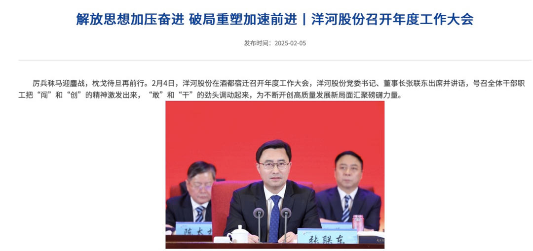 记者注意到,洋河股份今年年会与往年相比低调了许多。据洋河官网披露,去年2月4日,洋河股份召开年会,时任党委书记、董事长张联东高调号召全体干部职工把“闯”和“创”的精神激发出来,“敢”和“干”的劲头调动起来,为不断开创高质量发展新局面汇聚磅礴力量。