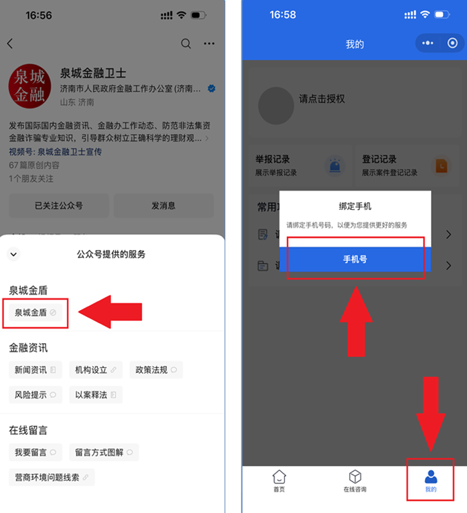 第一步:关注微信公众号“泉城金融卫士”,选择“服务”菜单中“泉城金盾”。