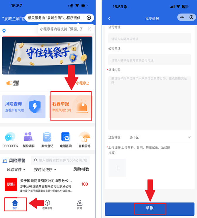 第三步:登录“泉城金盾”后,点击左下角“首页”,选择“我要举报”,填写相关内容后,点击“举报”提交完成。