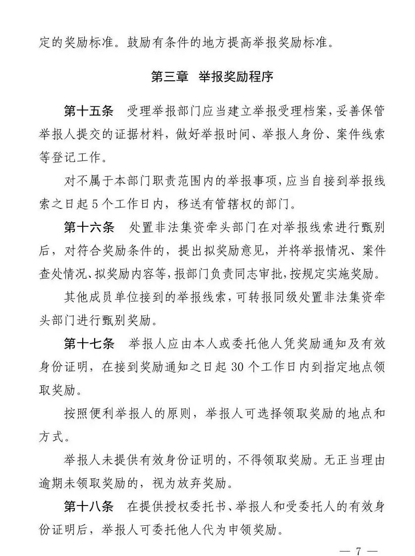 受理举报部门对符合奖励条件的,向举报人发放《非法集资举报奖励决定通知单》。举报人应由本人或委托他人凭奖励通知及有效身份证明,在接到奖励通知之日起30个工作日内到指定地点领取奖励。