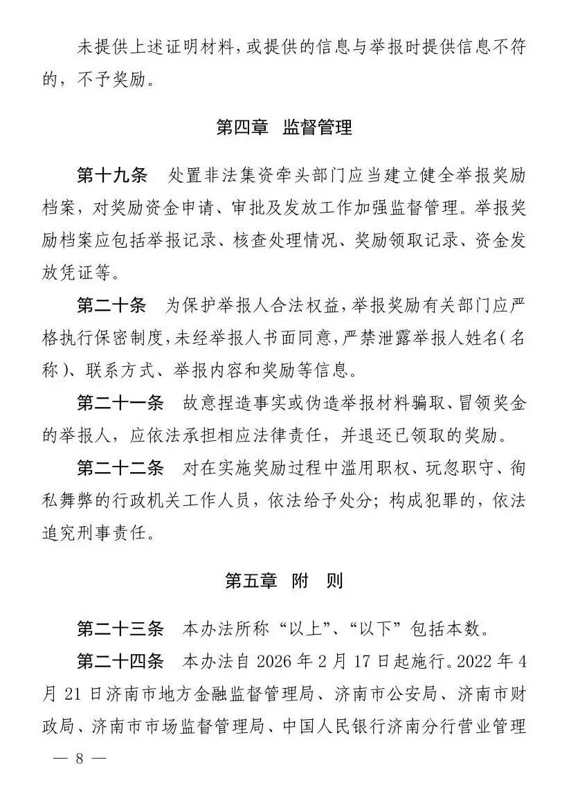 为进一步强化社会监督,及时发现非法集资案件线索,严厉打击非法金融活动,济南市新修订出台《济南市非法集资举报奖励办法》(以下简称《举报奖励办法》),自2026年2月17日起施行。新修订的《举报奖励办法》,进一步提高了奖励标准,降低了举报奖励门槛,优化了举报奖励程序。防范非法集资,既是守护自己的“钱袋子”,也是守护身边人的幸福;发现非法集资并主动举报,既是对自己负责,也是对社会的贡献,欢迎广大群众积极参与有奖举报。