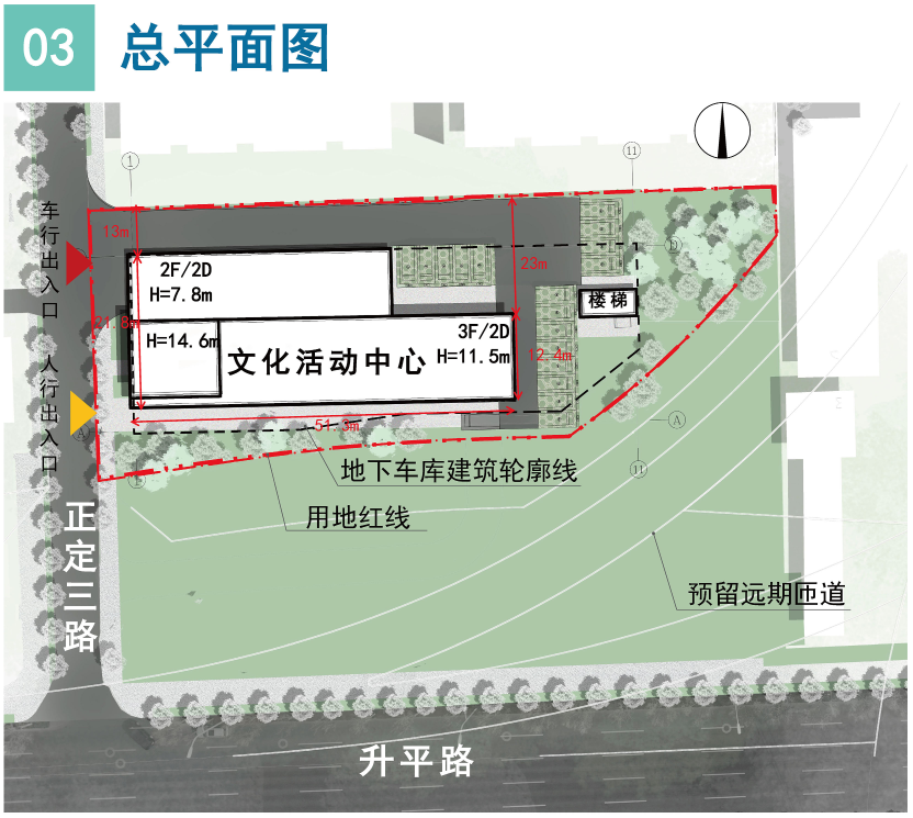 项目总平面图显示,文化活动中心主体建筑为地上2-3层,建筑高度7.8-11.5米,车行及人行出入口设置于正定三路一侧,地下车库建筑轮廓线清晰,同时预留远期匝道空间,兼顾当前使用与未来发展。从效果图可见,建筑采用现代简约风格,外立面以暖色调为主,搭配大面积玻璃幕墙,与周边居住环境相协调,建成后将成为集文化活动、便民服务于一体的社区公共空间。