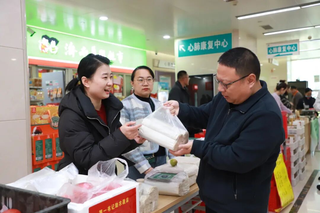 近日,济南市第五人民医院在外科楼一楼大厅举办驻村第一书记助农年货节,以消费帮扶搭起连心桥,以实际行动助力乡村振兴。医院派驻商河县玉皇庙镇、长清平安街道的两位第一书记,携两地50余类特色农副产品现场推介,医院职工与就诊家属踊跃选购,现场年味十足、暖意融融。